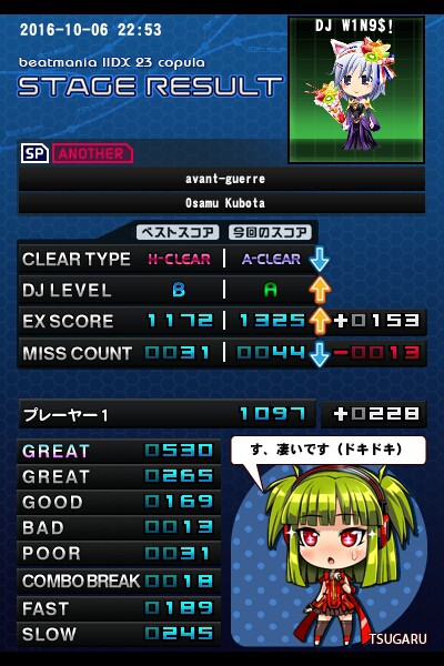 ☆10 avant-guerre(A) 開幕とラスト前に来る 縦連というか同時押しというか、が クセモノですね(・ω・) 私はそんなに辛くないのですが よしのんさんが苦戦とのことで トライ。 ひとまずノマゲ点けられて良かった良かった(^^) 私もスコア伸ばせてゆーなさんに プレゼント贈れたわ(・∀・) 遠征して収穫あって良かったo(^o^)o