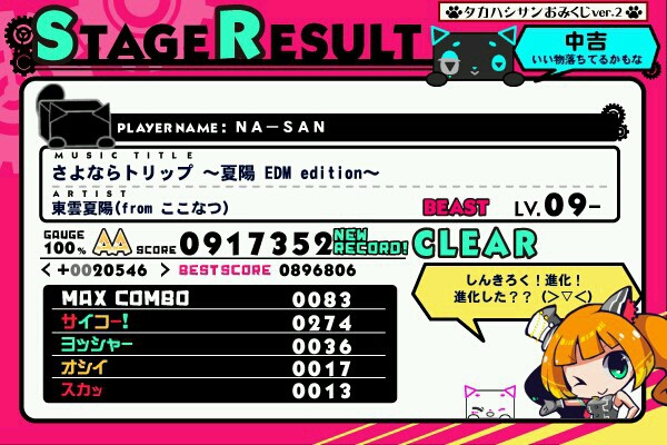 うっかりビーストクライシス選んで、うっかり特攻(笑) でもノルマ達成しました。 可愛い曲なのに、案外エグい譜面だよな