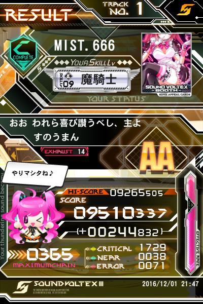われら主よEXH A→AA ショート乱打で相当削られまくったけど、ロングとつまみを大外ししなかった分でまあまあ伸びる、本当によくあるLv14のベストスコア更新パターンだ…。