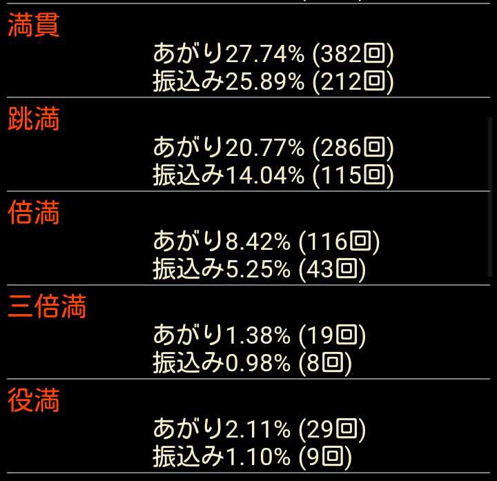 秋刀魚の上がり翻、とうとう役満が3倍満越えました(´・ω・`)ドラ爆とかないんでw 1~4翻合計が約4割です、これでもここ最近この辺り上がってるんですけどね(´・ω・)