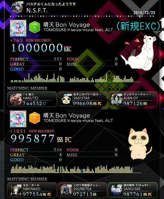 オン会正規サイド7曲目、晴天Bon Voyage。 BSC譜面が見事新規エクセ達成になりました。 確か以前指大会で残り4ノーツで1グして大雨が降ったいわくつきの譜面 (^^; ADV譜面もスコア更新しています。 HAKU*Z2さん、どえすーさん、AIANさん、菜花黄名子 指プラスマホさん、佐野さえるんさん、マチありでした♪