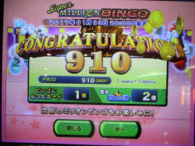 1月 5日スーパーミリオンビンゴで ビンゴスター使わず6等910枚獲得、 正直意外だった