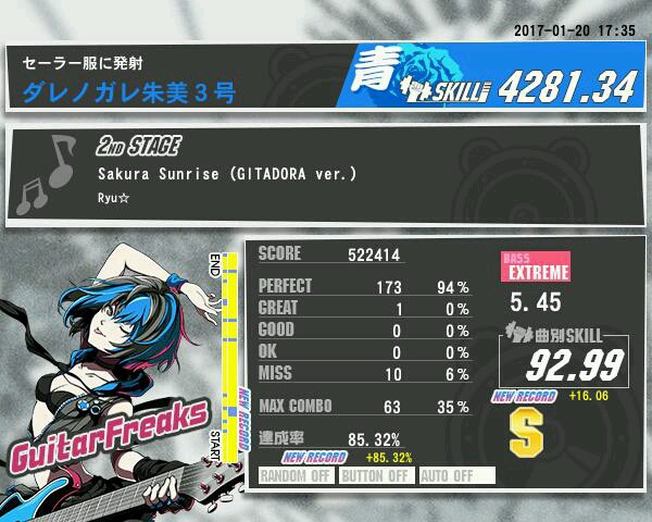 ◆1月20日のリザルト◆ ミス以外はなかなか良い感じにプレイ出来たかな〜スキル上がって嬉しい⌒Y⌒ヽ(★´з`)ノ^☆