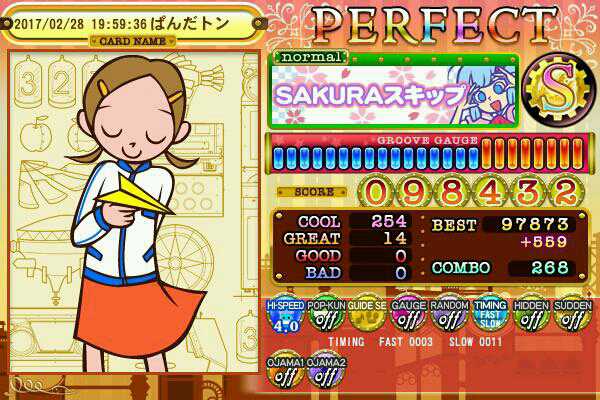 Easy埋めも一段落ついたので、100円2クレ なのをいいことにノーマルランクS埋めに チャレンジしてみることにしました。 SAKURAスキップN パフェスコア更新S。
