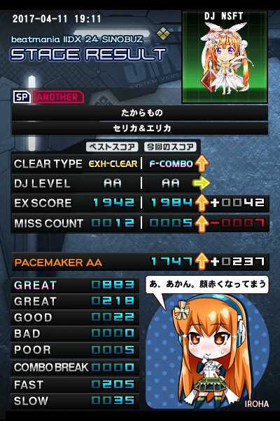 たからもの (A・Lv9-)、フルコン達成♪ 走り気味でしたが繋ぎきったです (*^-^*) スコアはAAA-13だった・・・もうちょい。 Medicine of love (A・Lv9-) が鳥乗せできたので次はこっちを鳥狙うですな。 スコアの都合上鳥乗るとほぼ2,000オーバーしますね。 ---これ以外のIIDX収穫--- ・ Let The Show Paint Me -Y&Co. Remix- (H・Lv6):FC ・ Release The Music (H・Lv7):難→EXH ・ Beat Radiance (A・Lv10):普