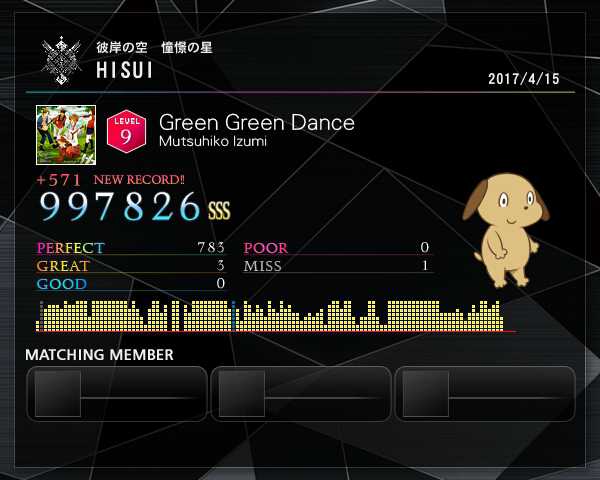 スコア更新 その5 Green Green Dance (EXTREME) 997826 +571 超絶微伸び(´・ω・`) 一番最初に抜けてしまったのが、勿体無かった(´・ω・`)