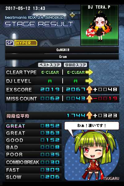 GuNGNiR ハイパー乱 何度かやってここまでスコア上げました。 右手がbroken…(-_-) ここまでBPM高いと最早光らせる意識は持てず、譜面についていくのがやっとですわ〜💧