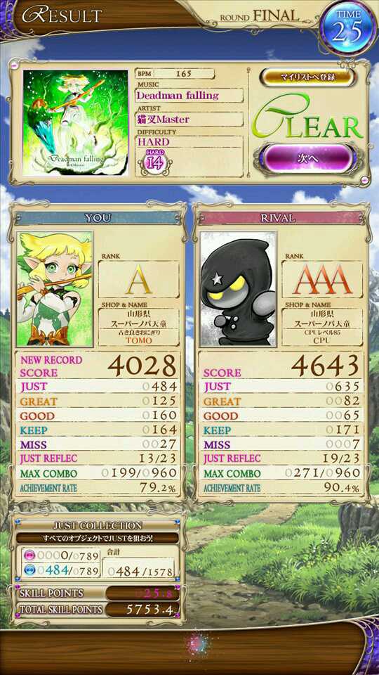 Deadman falling(WH)。 続けてホワイトハード譜面も。 先程手に入れたカードを早速装備しています☆ 看板キャラ3曲、残すは水の曲ですね(^_-)。