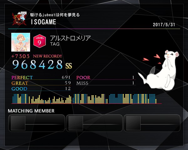 アルストロメリア★9 実は言うほどクソ譜面じゃないのでは?と思い始めた今日この頃 たまに現れる1+10の同時押しで10を見落とす事象が改善されればじゅうぶんフルコン射程圏内だよね