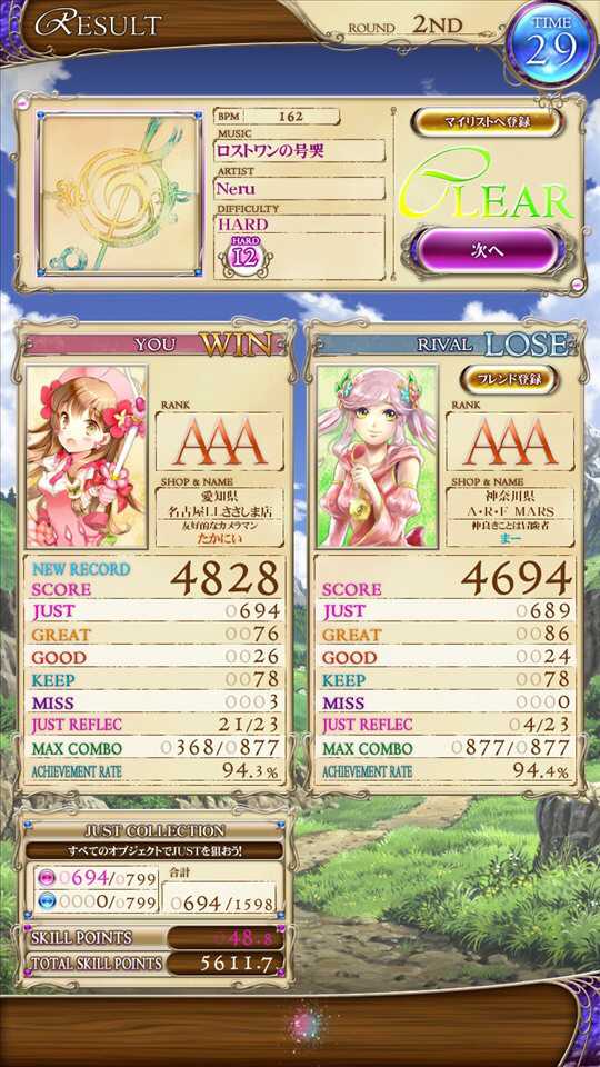 「ロストワンの号哭」白12でマッチングありがとうございました♪ リフプラの赤譜面は、Lv10のなかでも結構難しいです💧