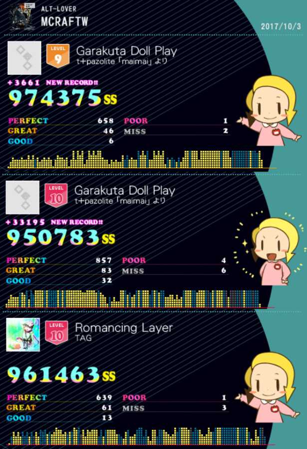 1st Garakuta Doll Play・黄 りりんさんの鳥FCに触発されてプレイ! 放置もしてるし、物量に慣れつつあるから鳥ぐらい行けるやr 無理でした。。。 師匠…さすがですm(__)m 少し記録更新してmissも減ったからまあいいか(´・ω・`) 2nd Garakuta Doll Play・赤 こちらは大きく記録更新、さらにダブル乗せ(`・ω・´) 終盤もっと見えるようになれば…。 final Romancing Layer ダブル(`・ω・´)
