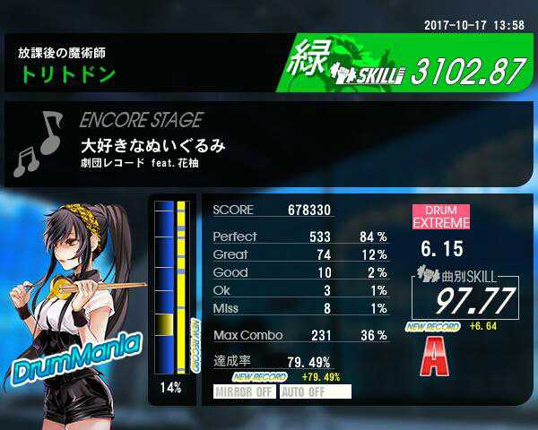 なんとなくぬいぐるみ ドラムもたーのしーぃ これもサビはLP踏みっぱ。まあ、2つ目のサビだけだけどね しかし難度値が1つ間違ってるような気がしてならない 侯爵夫人より簡単だぞ?