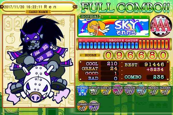 「pop'n music 5」 #pmJBC スカイ これもCS9で知った曲。パーキッツの中でTOPクラスに好きな曲の1つで、パキコレのアルバムの中では一番好きな曲です♩。この曲は是非ロングverを聴いてほしい曲で、2番以降の歌詞がとってもとっても素敵なんですよね!(力説) Nを初めてやった時は「誰よりも知ってる私達よ」の部分でゲージが全部無くなってましたw←。今回はラストの縦連打でGOODを出しちゃった。(無念)