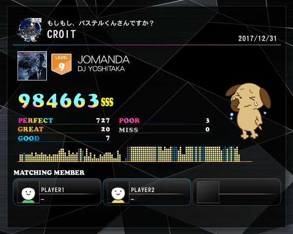 いつも切るところが繋がった時に限って、とっくにコンボ切れてる…。 それでも、最後にSSS取れて良かったな…なんて。 そんなわけで。 今日を最後に、よほどのことがない限り、JOMANDAは二度とやりません。 (よほどのこと→ギタドラにギタドロック化されて移植とか) いろんなことを思い出してしまって正直しんどいので。 出来れば最後にフルコンボしたかったですが…仕方ないですね。