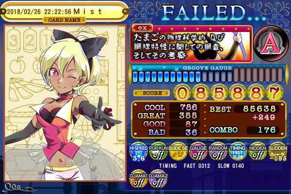 いつも通り今まで通り、ラスト減速前の右手側高密度発狂でゲージを物理科学的に破壊される 灰◆から先が途方も無く遠いのが現状だよ! たぶん、押せる押せない五分五分でなく完全な削り負けに陥ってるのはほんの2小節くらいなのだが… そこだけで空にはされないにせよボダ上から灰●域までほぼ瞬殺には違いなく。