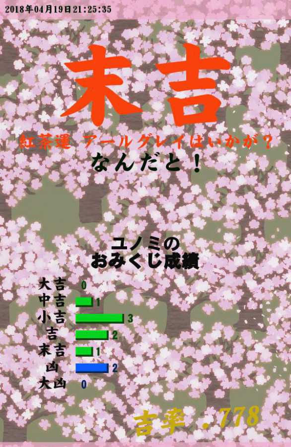 今日のおみくじ! 紅茶運はアールグレイとな 偶然だな、家にアールグレイあるんだ 後で飲もうっと(*?ω?) なんだと!…こっちのセリフだよ(´・ω・` ) http://p.eagate.573.jp/gate/e/toomikuji.html?from=article