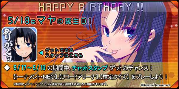 おめでとうございます! 5/18はマヤさんの誕生日! キャンペーン期間中(5/17~5/19)にプレーすると、 マヤさんのスタンプがもらえます!!#QMA #QMAXIV http://eagate.573.jp/game/qma/14/p/event/BD.html