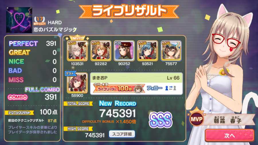 5/21日分、恋のパズルマジック(HARD)スコア微伸び、ALL PERFECT、ランクSSS、こちらも追々