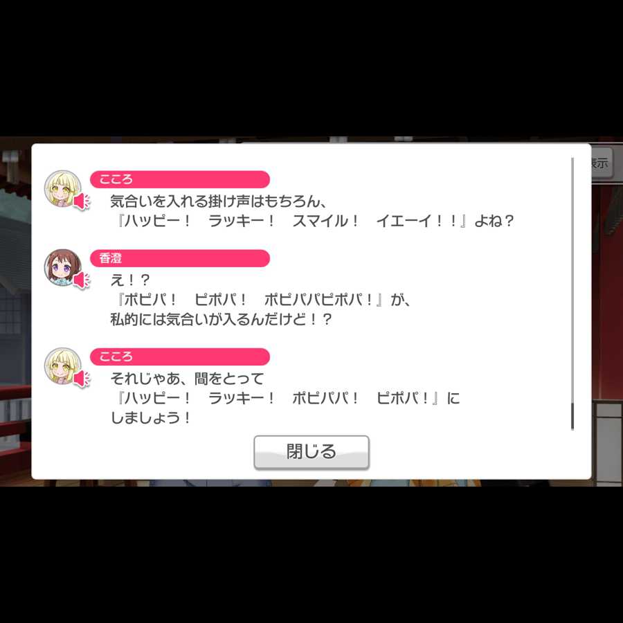 ツボった、掛け声 ハロハピは、 ハッピー、ラッキー、スマイル、イエーイ! だし、ポピパは、 ポピパ!ピポパ!ポピパパピポパー! だし(^_^;A 連続のガルパ投稿ですみません(>_<)