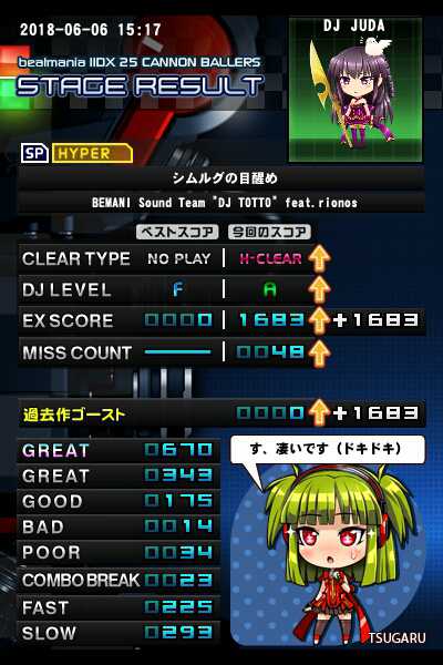そして大陸3も完走です レア敵勝てないのでスルーしてましたがまた直ぐに乱入してくるのがキツいです なお勝率80%で2回負けて最後まで勝てませんでしたw シムルグの目醒め 正規です これ☆10の中では結構難しいですね かなり曲が速くてBPM190以上に感じました ゲージ一桁で何とか耐えました