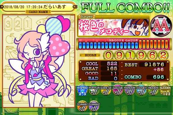 桜色のメロディーHフルコン出来ました。久しぶりにやったら1切りが2回続いたけど、次で繋がりました。