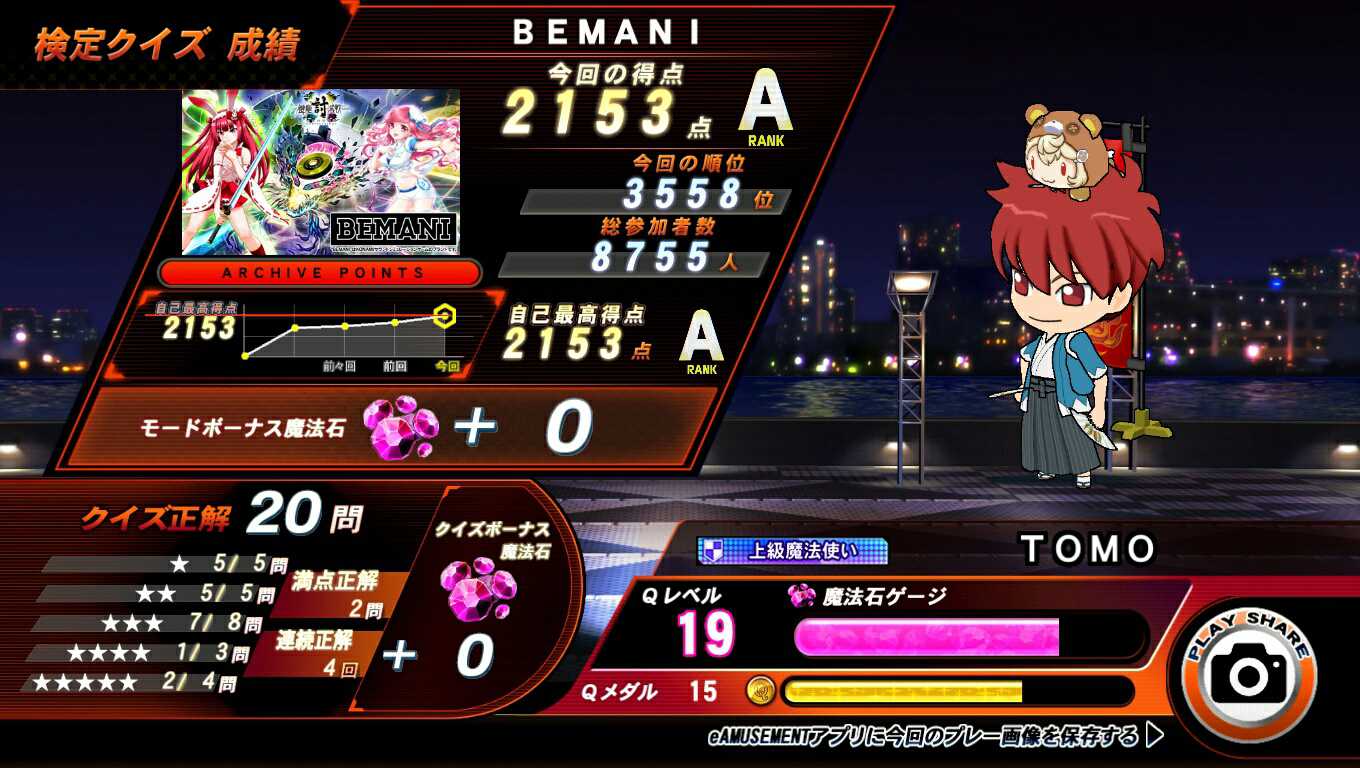 BEMANI検定。 ようやくAに☆ jubeat mobileの問題、結構な伸びでしたねww 一昨日はアプリQMA側のメンテにより出来なかった連動、本日ようやく行えました☆