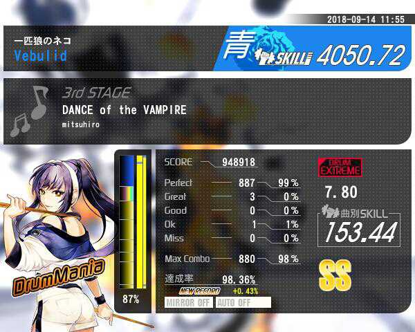 パンパイア赤譜面緊張しすぎて中々のパフェ率なのにフロアタムスカって死亡 このあとグレ8くらいでフルコン、デフォ曲の赤譜面で一番難しい 手が紫譜面と殆ど変わらないという地雷っぷり、8はあるっしょ 赤譜面は後はサンホリのだけ、慣れたらいける