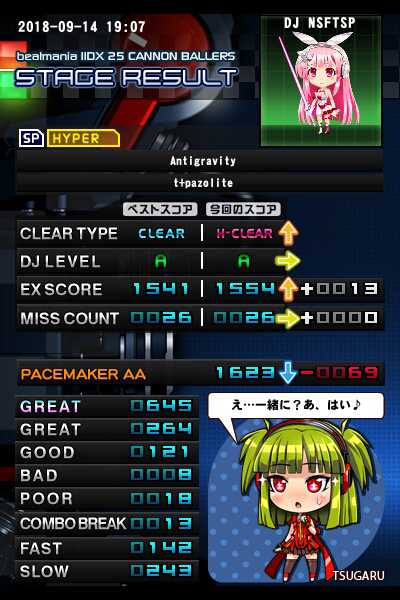Antigravity (SPH・Lv10):普→難。 新規Lv10ハードクリアその1。 終始忙しい譜面で再トライでどうなるかと思いましたが同じくらいのノリでハードもいけました♪ 後半の方が削られやすくて取りにくいか。