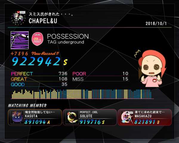 ポゼ赤ちょい伸びo< *´ω`* >oビローン 若者よりもスコアが上になったりすると一瞬ながら嬉しいものがあるねぇ_(:3 」∠)_
