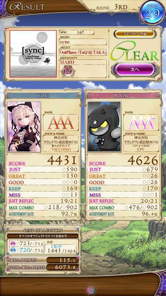 ラウンドワン横浜から帰る前にリフレシア1クレやりました ☆12sync AR、スコア伸びず
