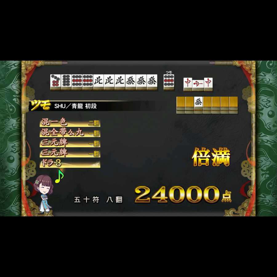 大きな上がりは、ドラ中をポンして、 暗刻の撥北と789が揃ったので、69筒子待ちで貼ってたら、 高めの9筒が来ました。 中撥チャンタホンイツドラ3で倍満です。