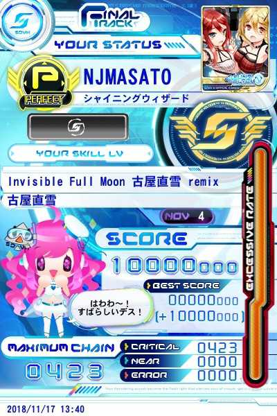 Invisible Full Moon 古屋直雪 remix(NOVICE)4連続!1発1000万点パーフェクト(PUC)達成!ボジョレーヌーボー解禁したから5ヶ月ぶりにボルテをやります!5曲目に僕が選んだ曲は「Invisible Full Moon 古屋直雪 remix」です!SOUND VOLTEX FLOOR「東方永夜抄リミックス楽曲コンテスト」採用曲!初めて「Invisible Full Moon 古屋直雪 remix」を聴きましたけど!とってもとってもカッコいい曲ですね!アーティスト名の『古屋直雪』さんと言えば!ポップンオリジナル楽曲コンテストで赤ボタンを全く使わない「beat it together」の曲で採用されてますね!しかも今回、古屋直雪さん自身初の東方アレンジ曲となります!待たしても初プレイでいきなり1発PUCを取っちゃいました!Invisible Full Moon 古屋直雪 remix!4連続!1発1000万点パーフェクト(PUC)を取れて最高に嬉しいです!5ヶ月ぶりのボルテなのに東方曲2曲連続で1発PUC!!