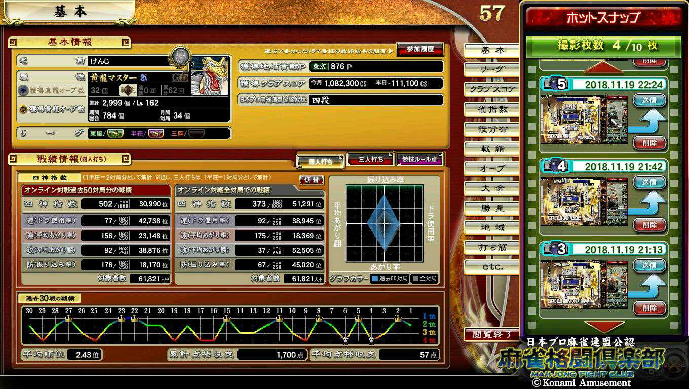 昨夜の成績 半荘リーグ 9対局 玉は+でしたが、ぶっ飛びが響きました。