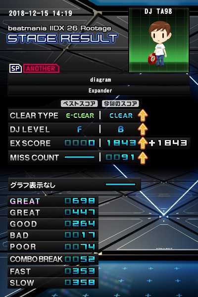 diagram穴ノマゲクリア!譜面は低速ながらもズレ、階段、縦連、皿複合、二重階段など高密度かつ意地悪な構成です。前半もかなり難しいですが中盤の連皿地帯を抜けたあたりから更に難易度が上がり皿+二重階段の長いラス殺し地帯になっています。多少ワシャワシャでもある程度拾えますのでとにかく譜面に喰らいつくことが重要です。難易度は☆11でもかなり強め。少し傾向は違いますが怠惰穴クラスだと思います。