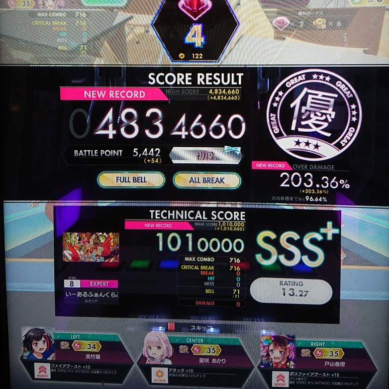 【他社ゲー オンゲキ編です】 昼オンゲキ一番のハイライト! いーあるふぁんくらぶ(EXP 8)まさかまさかの…理論値キタ━(゚∀゚)━! 途中からふと、あれっもしかして…と思い心臓バクバクでプレーしてました。 本当に決まってめちゃくちゃ嬉しいですよ~♪ヽ(´▽`)/
