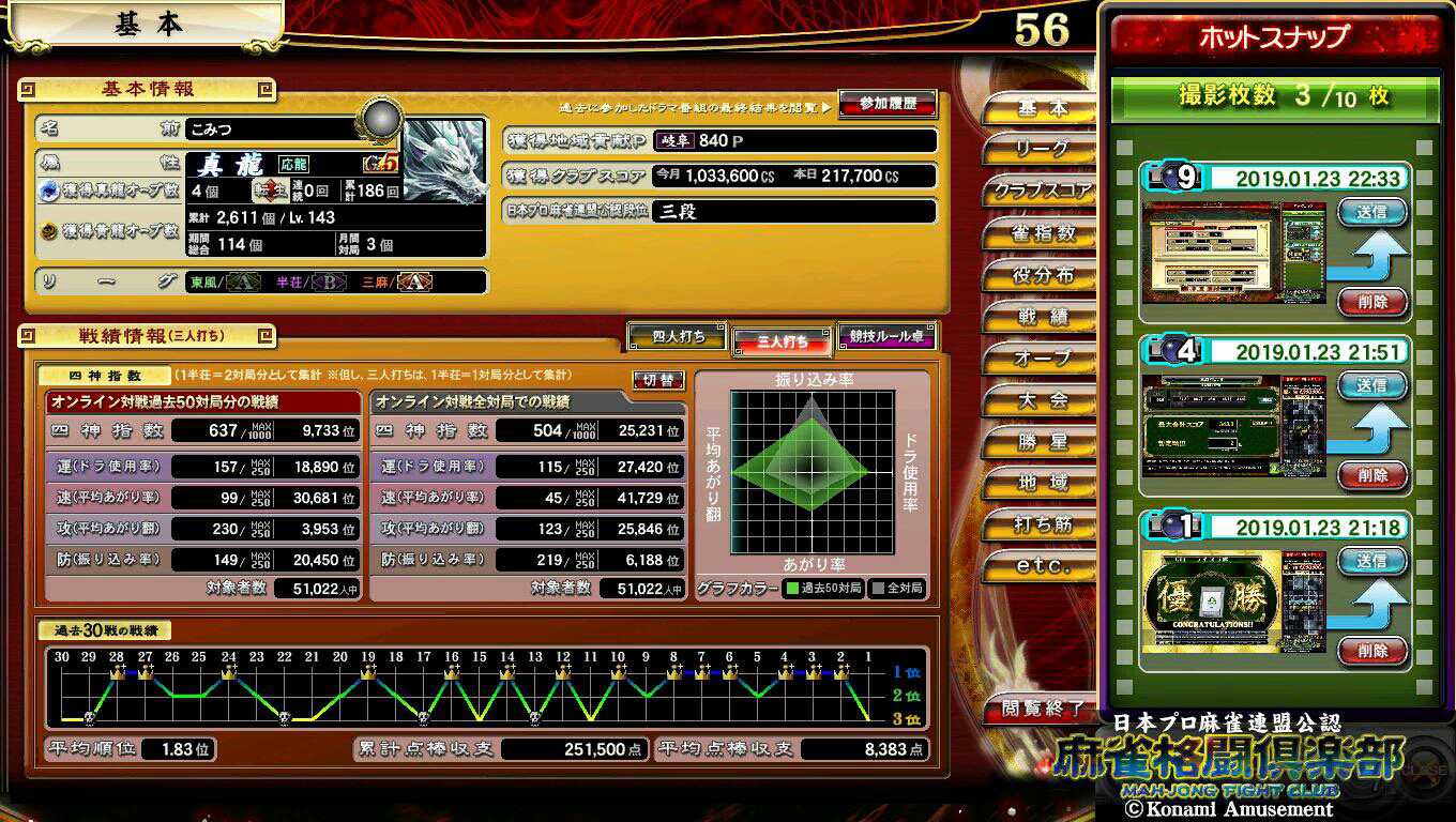 大会スコア更新を狙って打つとこういう大味な成績になるんだな。1位と3位が多い麻雀は打っていて楽しい。 やっぱり自分は堅実麻雀よりこのマージャンかな🎵