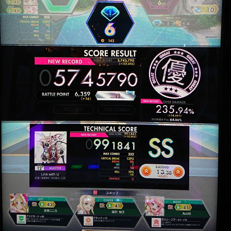 【他社ゲー オンゲキ編です】 昨日夜の部。まずはオンゲキから。 Link with U(MAS 12+)自己ベスト更新です。やり直した中で唯一のスコアアップです。
