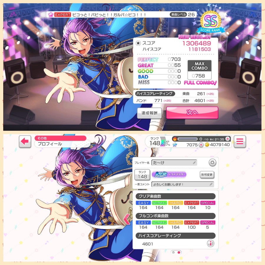 【他社ゲー バンドリの話です】 さらに…エキスパート譜面記念すべき100個目のフルコン♪ヽ(´▽`)/ 100個目はピコっと!パピっと!!ガルパ☆ピコ!!!(EX)です。最近エキスパート譜面のフルコンが少しずつ増えてきまして、100個目はこれにしようとやったら出来ました( ゜∀゜) 27以上のフルコンがまだ一つもないので…そろそろ着手していきたいところ。頑張ります。 ガルパ☆ピコは…とっても良いゾ~w( ゜∀゜)