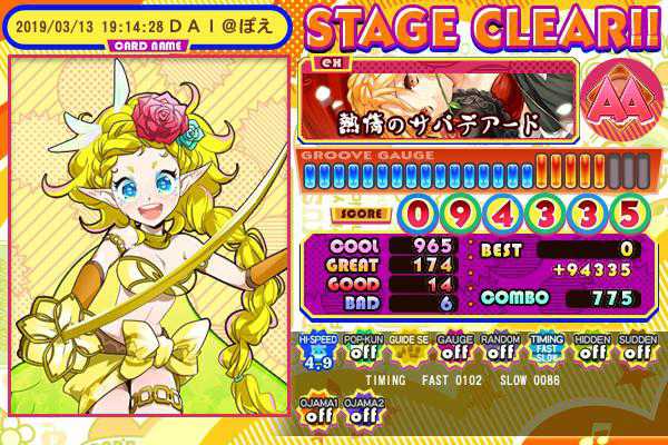 熱情のサパデアードEX 曲調が割と珍しいせいか掴みにくい気がする とはいえ譜面的には割と素直かも