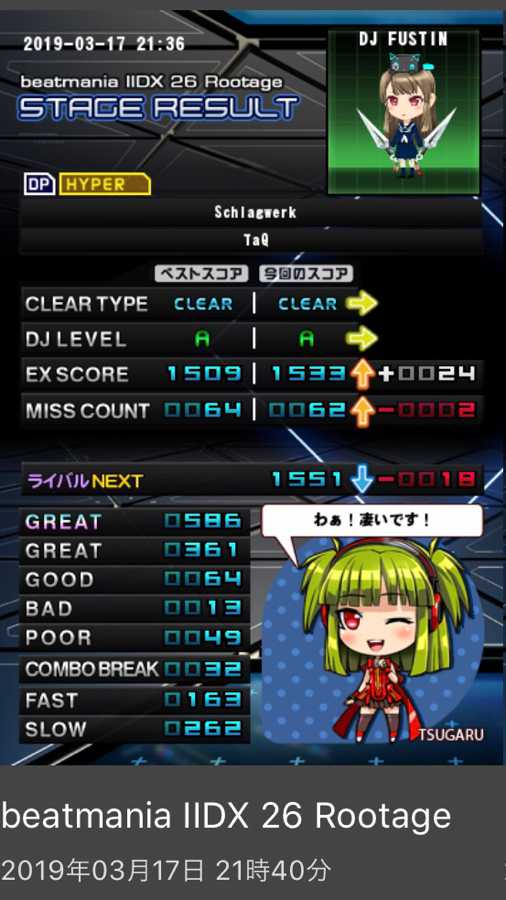 Schlagwerk(H) シュラークヴァークで良いの? こっちはまだ簡単ね、ハードは遠いけど後半の回復があったかいわ。 正規が左側で、右鏡のみが右側。 右鏡のみの2回目は、アナザーをプレーしたつもりがカーソルミスしちゃったわ。