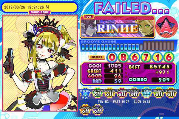 リンネ 49 メダル更新★! ああああクリアライン乗ってたのにラスト同時押しでやらかしたあああ!! にしてもBAD多すぎ問題。私は空BAD出しやすいからもっと精度上げねばなぁ……。