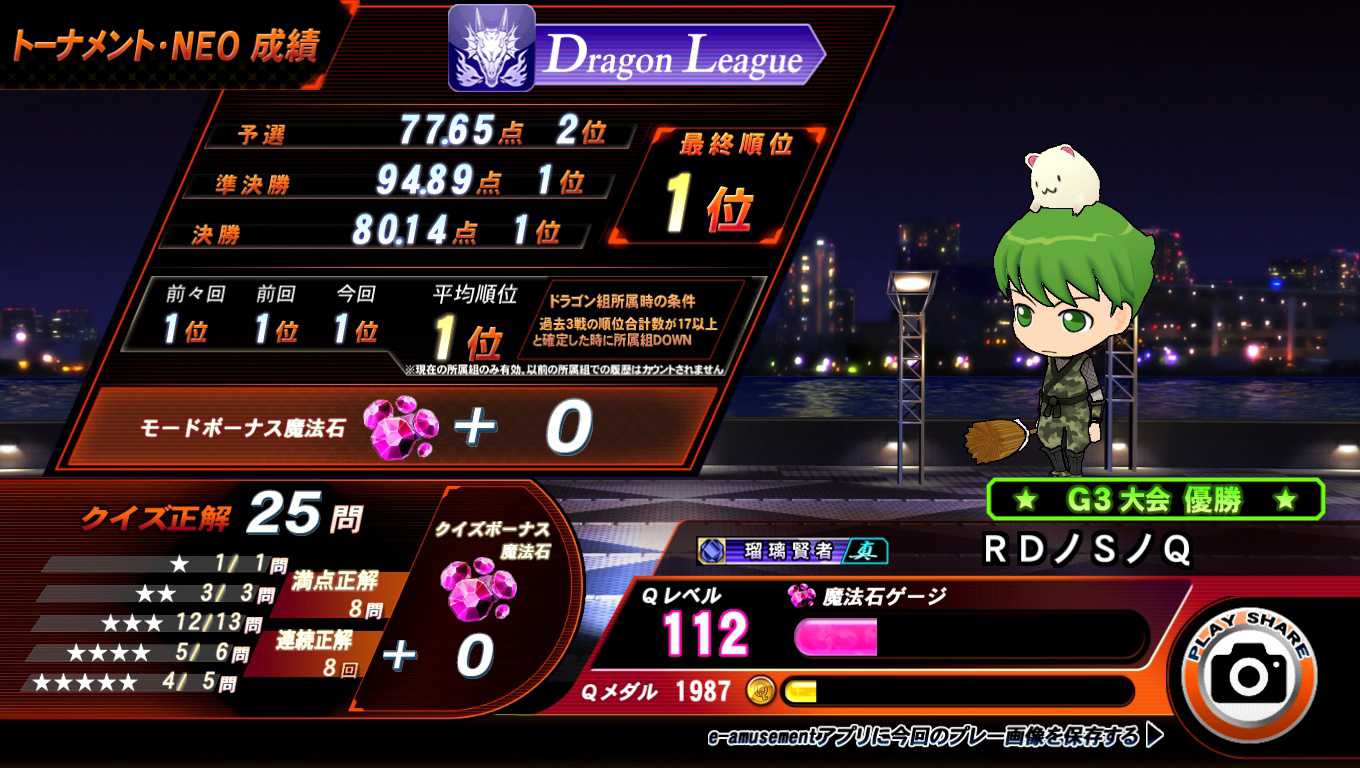 トナメ。 土日の賢竜杯オンオフは結局、あまり参加できずに時間切れ。ドラゴン組に留まったまま次学期を迎えることになりました。 正解率等の振り返りは、お見せできるほどのものではないので割愛。また来学期も(明日からですが)よろしくお願いします。
