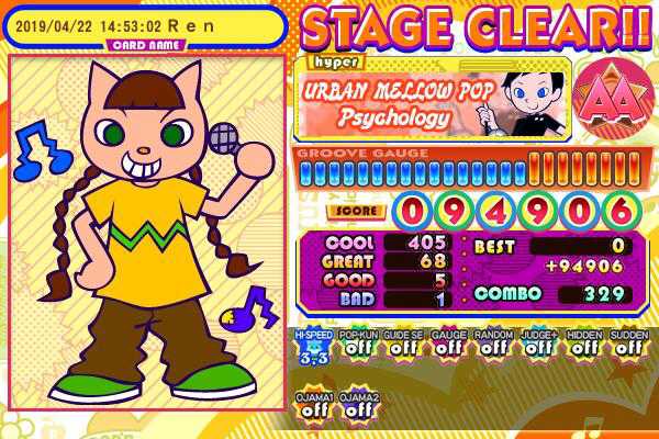 アーバンメロウポップ #pmJBC フォロワーさんが挙げた曲2-2。存在自体は知ってたけど、ぶっちゃけノーマークでした(ぉぃ)。N譜面はやった跡があったので今回はH譜面をプレイ。途中でミスってBAD1残念賞出しちゃった^^;。余談ですが、担当キャラは割と好きだったりする。