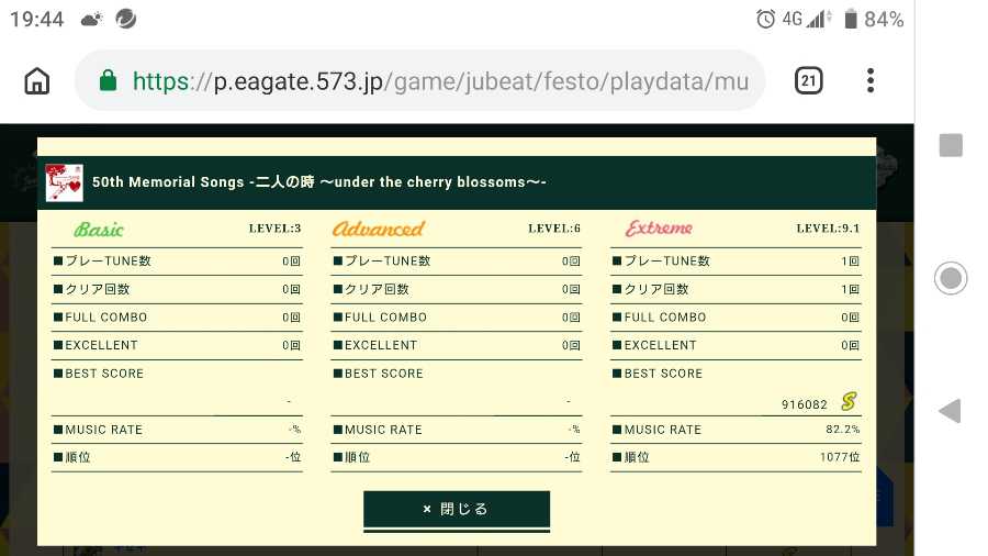Lv9.1 50th Memorial Songs -二人の時 ~under the cherry blossom~-(EXTREME) Pink Rose[2]以来、久方ぶりの9点台でのSだったり。 (TURN POSTがうまくいかなかったので、こうなりました)