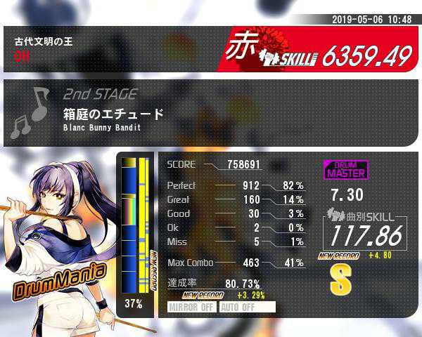 箱庭やっとS出てスキル下限地ながらも少し上がりました。 新曲117、旧曲124で上がりそうなネタ無くなって困ってきましたね… 精度も良くないので暫く6台ランセレで無造作にフルコン狙い頑張ってみます