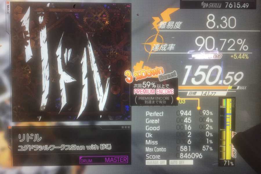 リドル紫D。90%。やっとスキル150を捻り出して来ました。あと1フレーズ取れそうな感じでしたので、もう少し頑張ります。 スキル+9.03