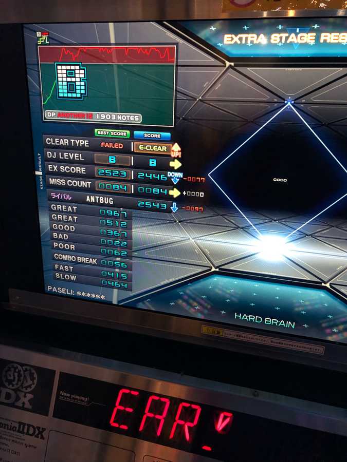 HARD BRAIN DPA 好きすぎて毎回やってしまうんだけど、もう一息足りなくて赤にできてない。 ラストで腕疲れてなきゃなーと思ったら1900ノーツぐらいあるのか… 脱力重要。 左鏡ー
