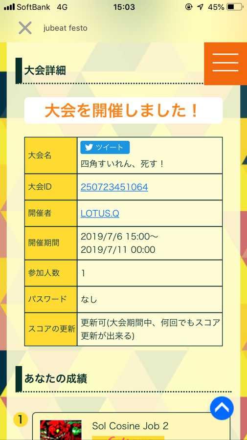 予告から遅れましたが、大会を開催しました。 今回は第2回のときみたいな、自分がクリアできない譜面で構成されてますが、パスワードはないのでどうぞご自由にLOTUS.Q(自分のjubeatでの名前)をフルボッコにしてください。 https://p.eagate.573.jp/game/jubeat/festo/contest/detail.html?contest_id=250723451064 【次回予告】 ピアノと料理は似ている…? Two Pianists BSC譜面 ロンロンへ ライライライ! BSC譜面