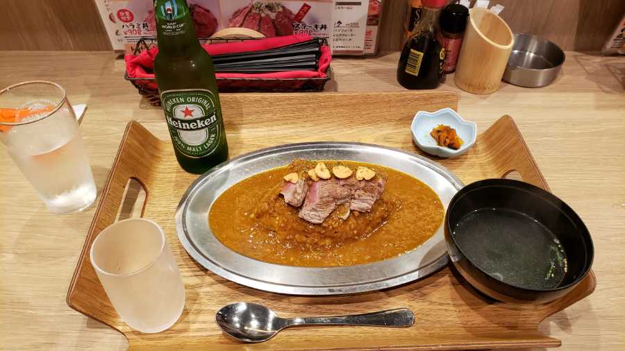 ビールクズ党員活動報告 キーマカレーにステーキが載ってるとゆー暴挙w こりゃビール頼まなきゃいかんでしよ! なお骨付き鳥もも2本定食なる品もある模様。なかなか肉々しいトコでした。