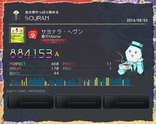 やっと出来たコナミコマンド!!←そっち?! 初ハードモードでプレイですね サヨナラヘヴン赤は唯一通常で鳥を出せた曲なんですが、この得点は自分がビックリしましたね…… とにかく光らない!! これがハードの闇か……